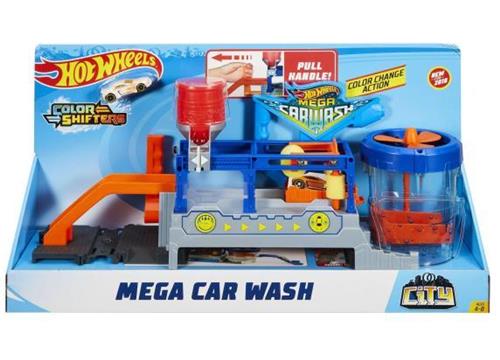 De Hot Wheels City Ultimate Series - Mega Car Wash brengt het plezier van een autowasstraat naar de speelkamer! Deze speelset is ontworpen als een echte autowasserette, inclusief een automatische transportband waarmee je de auto's door de wasstraat kunt laten gaan. Met verrassende kleurveranderingsfuncties worden de Color Shifters-auto's van Hot Wheels City tot leven gebracht. Trek de hendel naar achteren en laat je auto over de transportband rijden, spuit warm water op de auto en zie hoe de kleuren magisch veranderen!