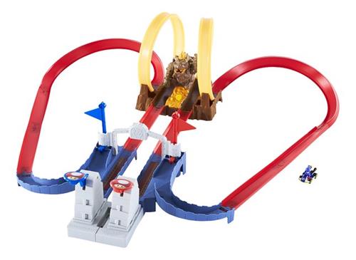 Hot Wheels brengt de opwinding van Mario Kart naar jouw speelruimte met deze baanset Chaos in het Kasteel van Bowser! Race met Mario in zijn metalen Yoshi-racevoertuig door de ovale baandelen, lanceer hem door de twee loopings en ontwijk de rondevlaggen. Pas op voor de gevaarlijke Bowser die op de loer ligt om Mario te stoppen!