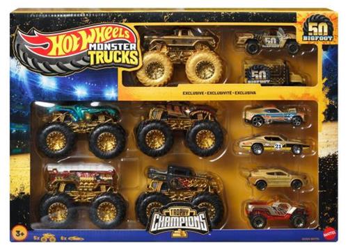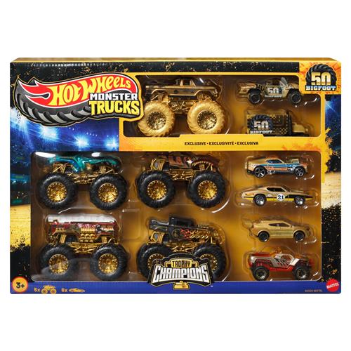 De Hot Wheels Monstertrucks Collectie Bekerkampioenen is dé perfecte manier om de 50ste verjaardag van Bigfoot te vieren. Deze speciale set bevat vijf favoriete personages als speelgoedtruck, waaronder Monstertrucks Bigfoot in een prachtige goudkleurige deco, 5-Alarm, Bone Shaker, Tiger Shark en Mega-Wrex. De set bevat ook zes metalen auto's, elk met goudkleurige accenten die deze gedenkwaardige mijlpaal extra speciaal maken.