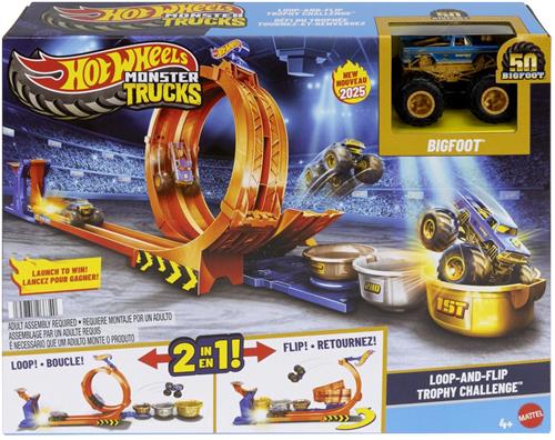 De Hot Wheels Monster Trucks Loop-And-Flip Trophy Challenge-Racebaan is een must-have voor jonge autoliefhebbers. De speelset is ontworpen door het bekende merk Hot Wheels en beschikt over een metalen Hot Wheels Monstertrucks Bigfoot op schaal 1:64 met unieke decoraties voor zijn jubileum. Alle onderdelen zijn van hoogwaardige kwaliteit kunststof, metaal en plastic gemaakt, waardoor de speelset lang meegaat en bestand is tegen intensief spelen.