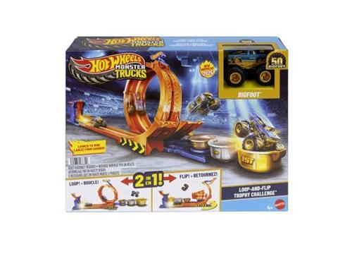 Vier de 50ste verjaardag van Bigfoot met de Hot Wheels Monstertrucks speelset Loopen en Draaien Trofee! Deze kleurrijke speelset biedt twee speelmogelijkheden om de vaardigheden van kinderen te testen. Lanceer de meegeleverde Bigfoot (schaal 1:64) in een volledige looping en in een van de trofeeën, of draai de looping om zodat Bigfoot een backflip doet in een van de trofeeën. De trofeeën variëren in formaat en puntenwaarde om de uitdaging nog groter te maken. Kinderen kunnen op verschillende manieren spelen - probeer als eerste in elke trofee te landen om de meeste punten te scoren. De metalen Bigfoot heeft exclusieve decoraties ter gelegenheid van zijn 50ste verjaardag en zorgt voor uren speelplezier.