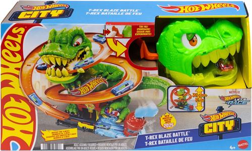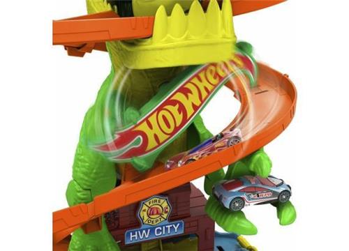 De set bevat een grote aanvallende dinosaurus die de Hot Wheels City brandweerkazerne aanvalt. Laat je auto's met volle vaart racen om de T-Rex te stoppen en zorg ervoor dat je tank altijd vol is voor de volgende reddingsactie. Kinderen vanaf 4 jaar leren al spelenderwijs het belang van doorzettingsvermogen en vastberadenheid in de strijd tegen deze dinosaurus. Doe mee aan het spannende gevecht en red Hot Wheels City van de ondergang!