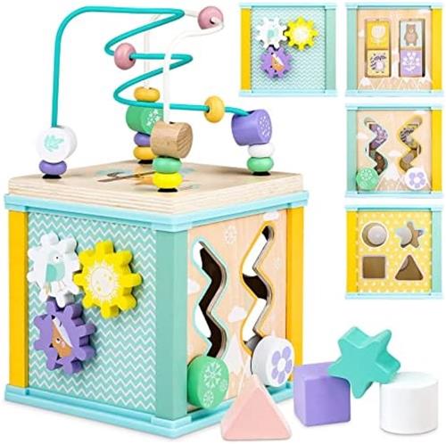 Ontdek de veelzijdigheid van de Houten Activiteiten Kubus, een perfect cadeau voor baby's en peuters vanaf 1 jaar! Deze innovatieve kubus biedt maar liefst vijf verschillende educatieve spelletjes in één, waaronder een kralen doolhof, vormen vergelijken, draaiende versnelling, blokkenrace en een draaiende puzzel. Dankzij de interactieve elementen stimuleert deze kubus de denkvaardigheden, zintuiglijke ontwikkeling en motorische coördinatie van je kind op een speelse manier.