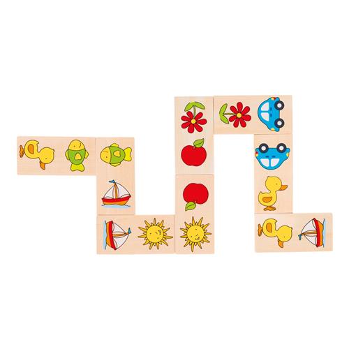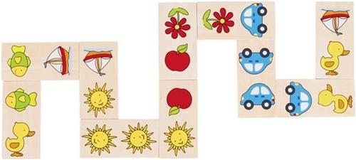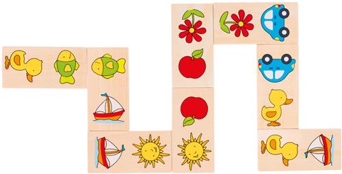 Dit dominospel bevat 28 houten dominostenen met sprekende, kleurrijke illustraties van alledaagse dingen, zoals een auto, bloem of eendje. Zoek dezelfde afbeeldingen en leg ze tegen elkaar aan.