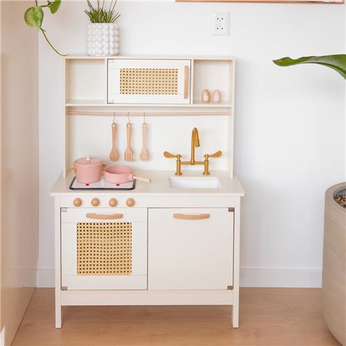 Wat ben je aan het koken, kleine chef-kok? Bereid de lekkerste gerechten samen met jouw kleintje in deze schattige houten keuken. Verwen je familie of je favoriete poppen en knuffels met een zelfgemaakte maaltijd. Met de twee pannen en het keukengerei ben je er klaar voor om een meesterkok te worden! Vanaf 3 jaar. Inspireert rollenspel Peuters houden ervan om volwassenen en hun dagelijkse routines na te bootsen. Deze keuken zal een droom zijn die uitkomt voor kleine chef-koks. Het inspireert rollenspel, creativiteit, motoriek en verbeelding. De stevige houten keuken in moderne kleuren creëert een heerlijke speelruimte in een kinderkamer maar staat ook prachtig in een woonkamer.