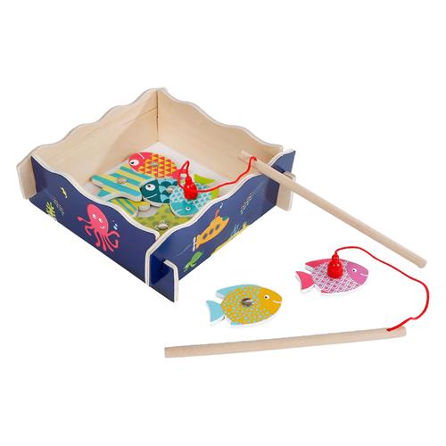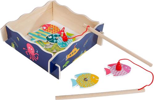 Het Houten Magnetisch Visspel, 15dlg, is een vrolijk gekleurd vishengelspel voor een of twee jonge vissers. Maak gebruik van de twee magnetische hengels en kijk wie de meeste vissen kan vangen. Het spel bevat 15 leuke zeedieren en helpt bij de ontwikkeling van hand- en oogcoördinatie en behendigheid. Het is geschikt voor kinderen vanaf 2 jaar oud.