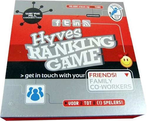 Beleef het ultieme samensmelten van online en offline met het officiële Hyves bordspel! Laat je onderdompelen in een wereld waarbij je strategisch de vijf opties van een onderwerpkaart op volgorde plaatst, terwijl je medespelers proberen in te schatten hoe jij deze 'ranking' bepaalt. Met een speelbord, 77 dubbelzijdige onderwerpkaarten, rankingbordjes, rankingkaartjes, pionnen, dobbelsteen en scoreblok is dit spel compleet. Spanning, strategie en competitie komen samen in dit unieke gezelschapsspel van Hyves.