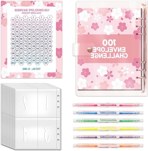 De 100-enveloppen uitdaging wordt geleverd met een stijlvolle A5-ringband, vervaardigd uit hoogwaardig PVC materiaal. Dit maakt de map niet alleen duurzaam, maar ook water- en scheurbestendig. De map bevat 100 voorgedrukte kasenveloppen, zodat je eenvoudig jouw spaardoelen kunt organiseren. Daarbij is de compactheid van deze map perfect voor onderweg, zodat je altijd je spaarplan bij de hand hebt.