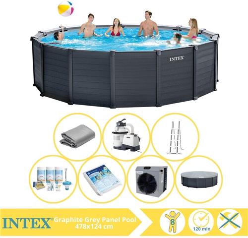 Intex Graphite Gray Panel Zwembad - Opzetzwembad - 478x124 cm - Inclusief Onderhoudspakket, Glasparels en Warmtepomp CP