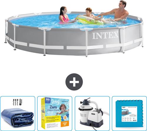 Intex Rond Prism Frame Zwembad - 366 x 76 cm - Grijs - Inclusief Solarzeil - Onderhoudspakket - Zwembadfilterpomp - Vloertegels