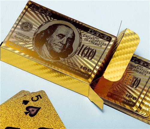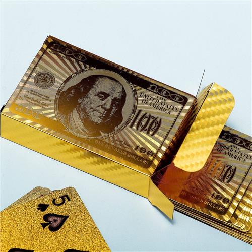 Speel als een miljonair met het Invotis Kaartspel - Gouden Dollar. Deze set speelkaarten is gedecoreerd met goudkleurig folie aan de achterkant, ontworpen als een 100 dollar biljet. De voorkant van de kaarten heeft een elegante matte gouden kleur, waardoor elke kaart een luxe uitstraling heeft. Met een afmeting van 6 x 9 centimeter is dit een complete set voor een super-de-luxe potje hartenjagen of 21-en. Het spelsoort is speelkaarten, geschikt voor kinderen vanaf 6 jaar. Een ideaal cadeau voor zowel jongens als meisjes, met een maximum van 20 spelers per spel.