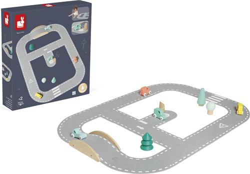 Janod Bolid - Vilten Circuit - Een Constructieset Met Makkelijk Te Monteren Wegdelen - Inclusief 9 Houten Accessoires - Geschikt Vanaf 2 Jaar