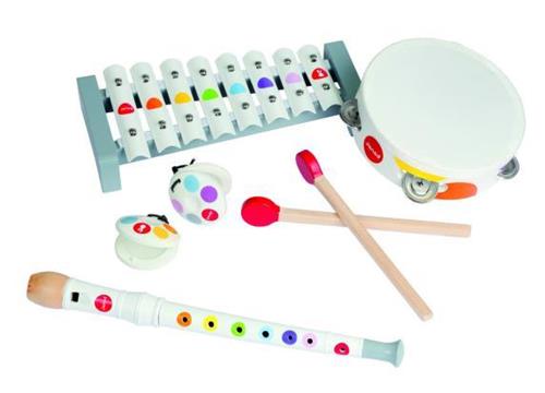 | Verpakkingsinhoud | Houten muziekinstrumenten set van de serie Confetti met een blokfluit (doorsnede 3cmx31cm), een tamboerijn (15x15x4,5cm), castagnetten (doorsnede 6cm) en een metalen xylofoon met 8 toetsen (25x12x4,5cm). |