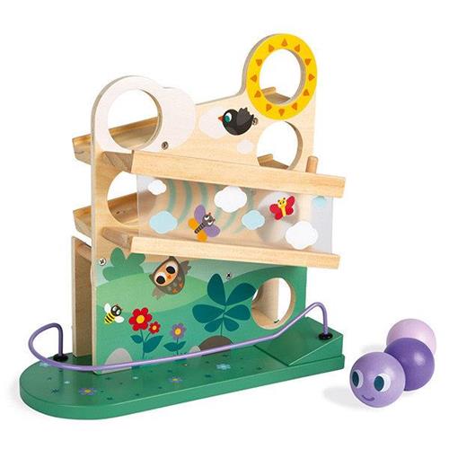 Deze mooie, houten ballenbaan rups van Janod is uitgerust met 3 ballen die door de zon en de wolken en de transparante tunnel passeren. Terloops klinken ze aan de bel en landen in de tuin, waar ze een rups vormen. De ideale activiteit om de oog-handcoördinatie van je kindje te ontwikkelen.