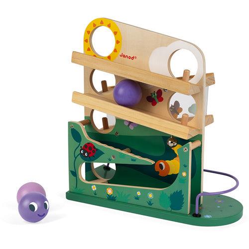 Deze kleurrijke houten ballenbaan van Janod laat de 3 ballen rollen langs de zon en door de wolken. Zijn alle balletjes beneden? Dan is je rups compleet. Elk kind is er gek op; bewegende ballen waar ze eindeloos mee kunnen spelen. Elke keer blijven ze enthousiast de bal bovenin leggen en zijn verrast als de bal eronder ook weer uitkomt. Herhaling is de kracht van elke ballenbaan. Geschikt voor peuters vanaf 1 jaar en zeer geschikt als verjaardagscadeau voor een eerste verjaardag.
