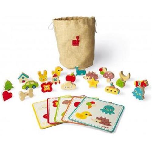 Janod houten memory spel 'ik leer' is een gezellig gezelschapsspel voor peuters en kleuters. Steek je hand in de zak en vind als eerste de 4 vormpjes die op de kartonnen speelkaart staan. Je mag alleen maar voelen. Maar let op de valstrik; heb jij het bot in handen, moet je alle vormpjes die al gevonden zijn terugstoppen in de zak. Het spel bestaat uit 5x kartonnen speelkaarten, 21x houten memorystukken en 1x katoenen zak. Geschikt voor peuters en kleuters van 3-6 jaar, 2 tot 5 spelers.