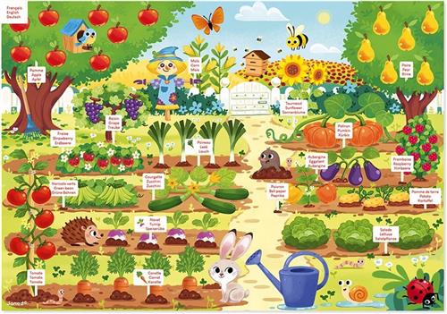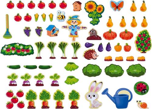 Voor kinderen van 3 tot 6 jaar. Een magneetbord om op te hangen of te plaatsen, met 70 magneten om een kleurrijke tuin te maken. Laat de fantasie bij uw kind de vrije loop terwijl hij de naam van de soorten groente en fruit leert. Educatieve poster, aan weerskanten bedrukt en in 6 talen, aan de binnenkant.
