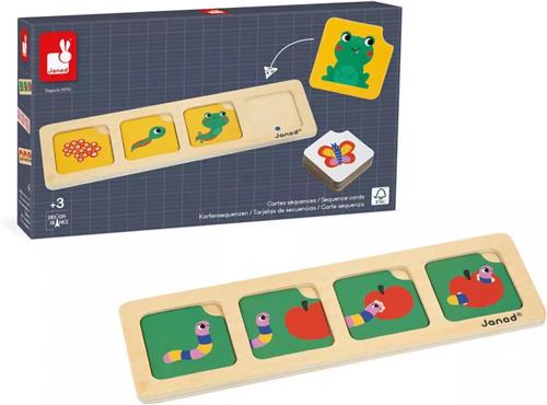 Hoe wordt een vlinder gevormd? Hoe verandert een zaadje in een bloem? Ontdek samen met uw kind de natuur met behulp van de volgordekaarten. Het doel van het spel is om de chronologie van elke actie te vinden. 10 acties van 4 stappen worden in het spel voorgesteld, dit zijn 40 kaarten, met tevens een houten houder. In het autonoom atelier leert uw kind de acties chronologisch te rangschikken en zijn of haar reflectie en aandacht te ontwikkelen. Een zelfcorrigerend systeem is tevens beschikbaar. In het kader van het duo-atelier kunt u uw kind tijdens het leren vergezellen: laat hem of haar de kaarten op de houder aanbrengen en het verloop van het tafereel uitleggen. Spel van FSCTM-hout en karton. Educatief spel ontwikkeld in samenwerking met een docente voor kinderen vanaf 3 jaar.