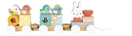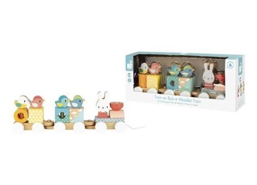 De Janod houten speelgoed trein uit de Pure lijn is een perfect kraamcadeau dankzij de zachte pastelkleuren en het schattige design. De trein bestaat uit een locomotief en 2 wagonnetjes, elk gevuld met stapelblokken en leuke diertjes. Een konijntje trekt de trein, gevolgd door vier vrolijke vogeltjes. Met afmetingen van ongeveer 31,4 x 6,8 x 11,5 cm is deze trein ideaal voor baby's en peuters vanaf 12 maanden oud.