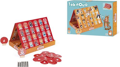 JANOD spel wie is wie? het bekende raadspel in maar dan met dieren! Heeft hij een pet op? Draagt hij een bril? Dan is het Boris het konijn! Kies 1 van de 2 spelborden, de variant met honden en katten, of de variant met andere dieren. Door vragen te stellen over het uiterlijk van de dieren en hun accessoires elimineer je de dieren die je tegenstander niet heeft gekozen. Draagt het dier van je tegenstander een pet? Dan plak je een zwart kruisje bij alle dieren zonder pet. Raad jij als eerste welk dier jouw tegenstander op zijn kaartje heeft staan? Dan ben jij de winnaar van dit Wie is het spel. Voor 2 spelers vanaf 5 jaar. Speelduur 15 minuten.