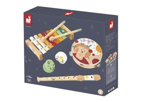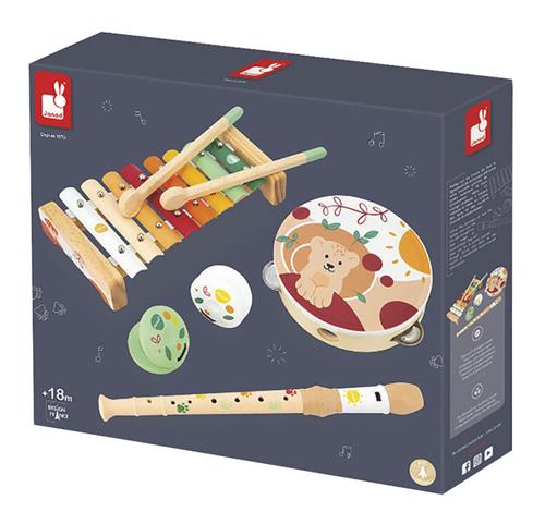 Janod Sunshine brengt de magie van muziek naar jonge kinderen met deze prachtige set van 5 houten instrumenten. Laat het muziekconcert beginnen terwijl kinderen de mogelijkheid hebben om verschillende geluiden te ontdekken en samen te spelen. Een xylofoon met 8 tonen, een tamboerijn, een fluit, en twee castagnetten vormen samen een complete set die de creativiteit en het ritme van kinderen vanaf 18 maanden zal stimuleren.