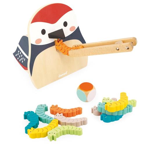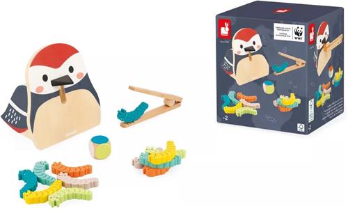 Het Janod WWF Kleurenspel Specht en Rups is een educatief spel dat de behendigheid en fijne motoriek van peuters vanaf 2 jaar stimuleert. Met dit houten behendigheidsspel kunnen kinderen de kleine bonte specht helpen door de juiste kleur rupsen met een houten tang aan hem te voeren. Het spel bestaat uit een houten vogel, een tang, een dobbelsteen en 12 houten rupsen. Ideaal voor de ontwikkeling van behendigheid, fijne motoriek en visueel geheugen.