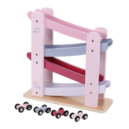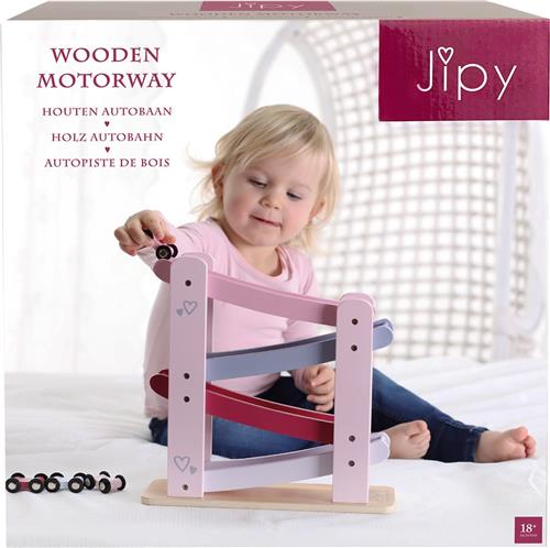 Woesj! De auto rijdt vanzelf naar beneden op deze roze houten autobaan van Jipy. Wanneer je kind bovenop een auto neerzet, kunnen ze kijken hoe die uit zichzelf naar beneden rijdt. Er zitten vier autootjes bij de set, die een voor een of allemaal achter elkaar op de baan te zetten zijn. Met de autootjes is natuurlijk ook los te spelen door ze voort te duwen. Tijdens het spelen ontwikkelt je kindje onder andere de hand-oogcoördinatie.