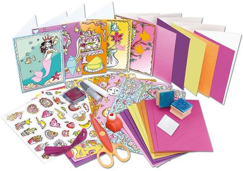 De set omvat 5 bedrukte kaarten, 5 effen gekleurde kaarten, 10 gekleurde enveloppen, patroonpapier, gewoon papier, stickervellen, kaartmotieven, kleefpads, een golfschaar, een hartvormige perforator, stempels, inktkussens, lint, glitterlijm, lijm en een handige handleiding. Alles is zorgvuldig samengesteld zodat kinderen moeiteloos aan de slag kunnen en hun eigen unieke kaarten kunnen ontwerpen.