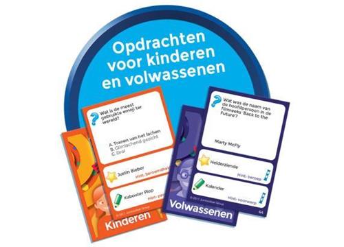 | Verpakkingsinhoud | Dubbelzijdig speelbord, 1 kaarthouder, 300 kaartjes (150 voor kinderen en 150 voor volwassenen), 12 uitdagingskaarten, 3 PartyKubussen, Dubbelzijdig PartyTekenbordje, Afwisbare stift, 2 zandlopers, 3 pionnen, Dobbelsteen en Spelregels. |