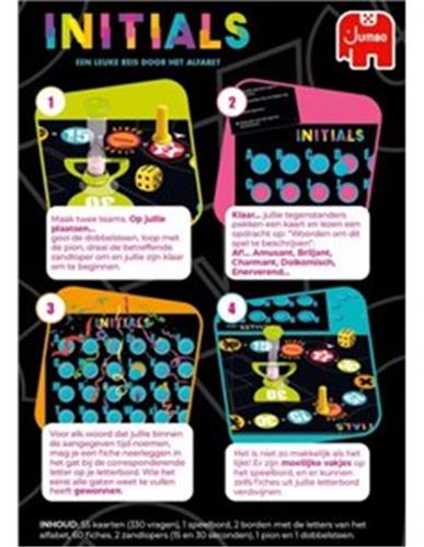 Maak een reis door het alfabet met het bordspel Initials van Jumbo!Test je woordenschat met het nieuwe partyspel Initials, van de makers van Party en Co! In dit spannende gezelschapsspel voor volwassenen en kinderen moet je zoveel mogelijk woorden bedenken met de verschillende letters van het alfabet om een fiche te winnen en het letterbord van jouw team te vullen. Maar wees snel! Elke ronde duurt maar 15 of 30 seconde, voor je het weet is je beurt weer voorbij! Daarnaast kan het andere team letters stelen en blokkades opleggen, waardoor de strijd spannend blijft tot de laatste letter! De spelregels van dit spel zijn simpel, waardoor het makkelijk aan te leren is en snel opgestart kan worden. Het kleine formaat van dit gezelschapsspel maakt dat het dat makkelijk mee te nemen is naar elke gelegenheid met familie of vrienden! Ga de strijd met elkaar aan Het doel van Initials is om als eerste team het letterbord vol te krijgen. Zo speel je het; 1.Maak twee teams. Het eerste team gooit de dobbelsteen, loopt met de pion en draait de desbetreffende zandloper om. 2.De tegenstanders pakken een kaart en lezen de opdracht voor die correspondeert met het aantal gegooide ogen. 3.Het team dat aan de beurt is, moet binnen de aangegeven tijd zoveel mogelijk woorden noemen die beginnen met de verschillende letters van het alfabet om een fiche te mogen leggen in de gaten bij deze letters op hun letterbord. 4.Het team dat als eerste alle fiches op het letterbord heeft gelegd, wint het spel! Kenmerken Initials - Gezelschapsspel voor volwassenen en kinderen vanaf 8 jaar, van de makers van Party & Co! - Gemiddelde speeltijd: 30 minuten - Partyspel van klein formaat dat de woordenschat stimuleert Inhoud - 55 kaarten (330 vragen) - 1 speelbord - 2 borden met de letters van het alfabet - 60 fiches - 2 zandlopers (15 en 30 seconden) - 1 pion - 1 dobbelsteen.
