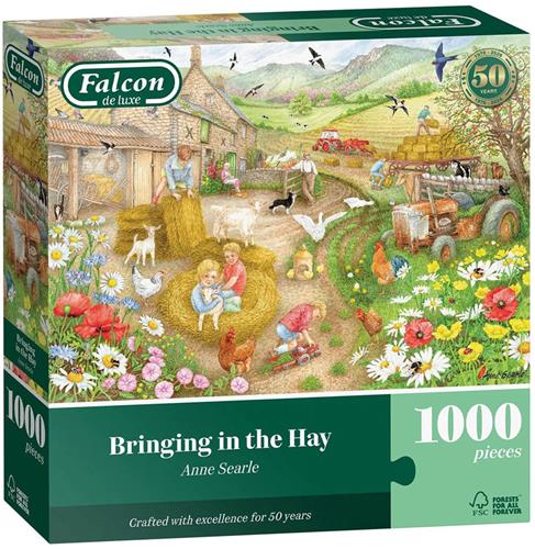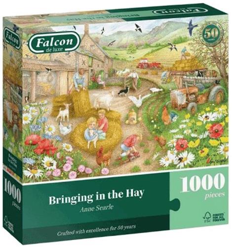 Ontdek de charme van het plattelandsleven met de Jumbo puzzel van 1.000 stukken van het thema "Bringing in the Hay". Dit kleurrijke puzzelontwerp van Anne Searle brengt de levendigheid van een boerderij tot leven, waar boeren aan het werk zijn met hooibalen, en kinderen zich vermaken in een knus hooinestje. Deze puzzel biedt urenlang plezier en is perfect voor zowel jonge als oudere puzzelaars.