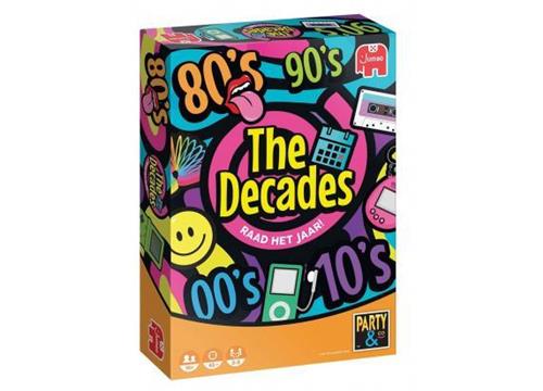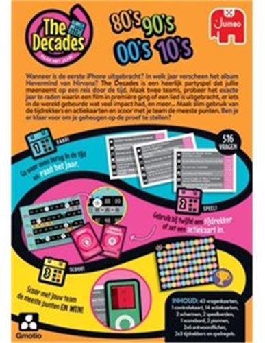 Ga terug naar de jaren 80, 90's, 00's, en 10's met The Decades van Jumbo!Wanneer is de eerste IPhone uitgebracht? In welk jaar verscheen het album van Nirvana? The Decades van Jumbo is een heerlijk partyspel dat jullie meeneemt op een reis door de tijd! Maak twee teams, neem het tegen elkaar op om de exacte jaartallen te raden en het spel te winnen! Ben jij er klaar voor om jouw geheugen op de proef te stellen?The Decades is een nieuw partyspel voor volwassenen van de makers van Party & Co.!Kenmerken - Geschikt voor 2- 8 spelers vanaf 16 jaar - Gemiddelde speeltijd: 45 minuten - Test je geheugen en bluf vermogen! - The Decades bevat 516 vragen voor vele avonden speelplezier! Raad, speel, scoor!