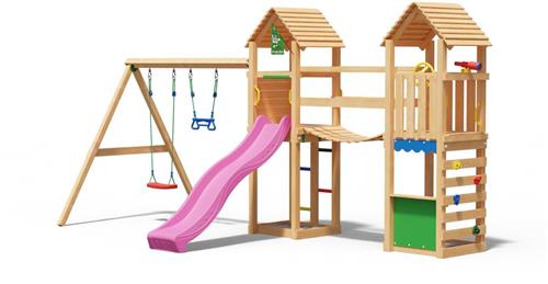 Het Jungle Gym speeltoestel Jungle Haven is het ultieme speelparadijs voor kinderen in de achtertuin. Gemaakt van verduurzaamd Douglas hout, biedt dit speeltoestel duurzaamheid en veiligheid voor urenlang speelplezier. Het ontwerp omvat een opwindende fuchsia glijbaan, een zandbak, een dubbele schommel en een klimmuur, waardoor elk kind zich als een ware avonturier kan voelen.
