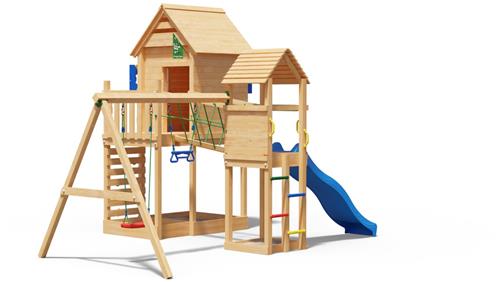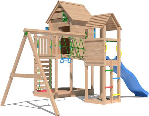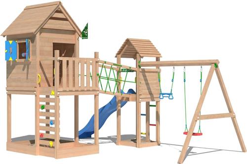 Het Jungle Gym Retreat speeltoestel is vervaardigd van hoogwaardig Douglas hout, waardoor het niet alleen stevig en duurzaam is, maar ook een prachtige toevoeging is aan elke tuin. Met de blauwe glijbaan, zandbak, dubbele schommel en speelhuisje is dit speeltoestel een complete speelervaring voor kinderen van 3 tot 10 jaar.