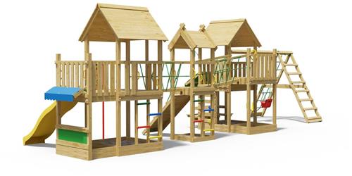 Betreed een wereld vol buitenplezier met het Jungle Gym Gazebo XXL speeltoestel! Met drie speeltorens tovert deze speelset jouw buitenruimte om tot een speelparadijs. Dit supergrote speeltoestel heeft een klimmuur, schommel, glijbaan, picknicktafel, marktkraam en nog veel meer en biedt eindeloze mogelijkheden voor actief spelen en creatief ontdekken. Je kleintjes kunnen via de uitdagende klimladders en muren naar de vele speeldekken klimmen en zich ertussen verplaatsen via de avontuurlijke netbruggen.