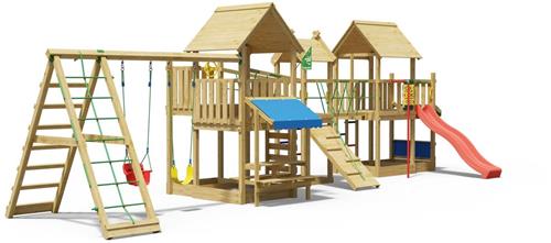 Jungle Gym speeltoestel van grenen hout - Jungle Gazebo XXL met rode glijbaan - Tuin speeltoestel voor buiten met schommels, klimwand en picknicktafel