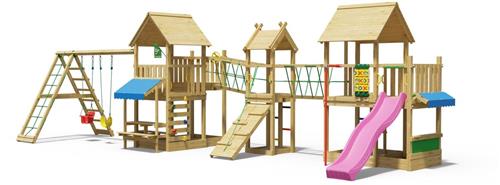 Betreed een wereld vol buitenplezier met het Jungle Gym Gazebo XXL speeltoestel van grenen hout! Dit speelparadijs in jouw eigen tuin heeft drie speeltorens en biedt eindeloze mogelijkheden voor actief spelen en creatief ontdekken. Kinderen kunnen zich uitleven op de klimmuur, schommel met flexibele zitjes, roze glijbaan, klimwand, brandweerpaal, loopbrug, picknicktafel en zandbak. Met de uitdagende klimladders en muren kunnen ze naar de vele speeldekken klimmen en zich verplaatsen via de avontuurlijke netbruggen.