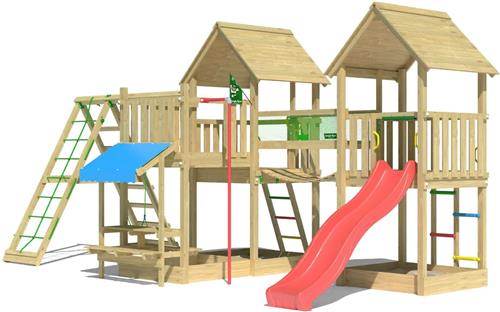 Jungle Gym speeltoestel van grenen hout - Jungle Luxor met rode glijbaan - Tuin speeltoestel voor buiten met zandbak, schommel en klimnet