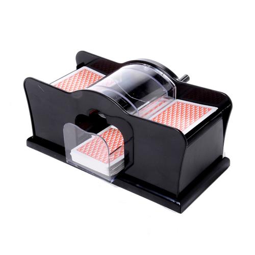 Met de handmatige kaartschudmachine schud je eenvoudig je kaarten. Leg de kaarten in de vakjes, draai aan de hendel en zie de kaarten over en weer vliegen. Wanneer je klaar bent met draaien, kun je de stapel kaarten zo uit het bakje halen. Exclusief pakje speelkaarten.