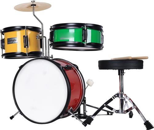 Kindertrommelset met Snare, Tom, Bass Drum en Bekken - Compleet Drumstel met Bass Drum Pedaal, Drumkruk en Drumstokken - Geschikt voor Beginners en Kinderen - Rood, Geel en Groen