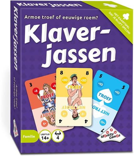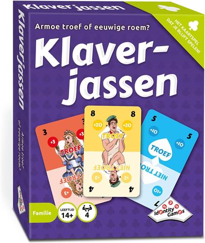 In dit tactische teamspel probeer je met je kaarten zoveel mogelijk punten te behalen voor je team. Maar pas op dat je niet te veel punten aan je tegenstander kwijtraakt. De Klaverjassen editie van Identity Games is geschikt voor zowel kinderen als volwassenen en heeft een aanbevolen minimumleeftijd van 14 jaar. Het spel heeft een speeltijd van 45 minuten en kan met maximaal 4 spelers worden gespeeld. De verpakking bevat 32 speelkaarten, een scoreblok en spelregels. Het materiaal van de kaarten is karton en het spel is volledig in het Nederlands.