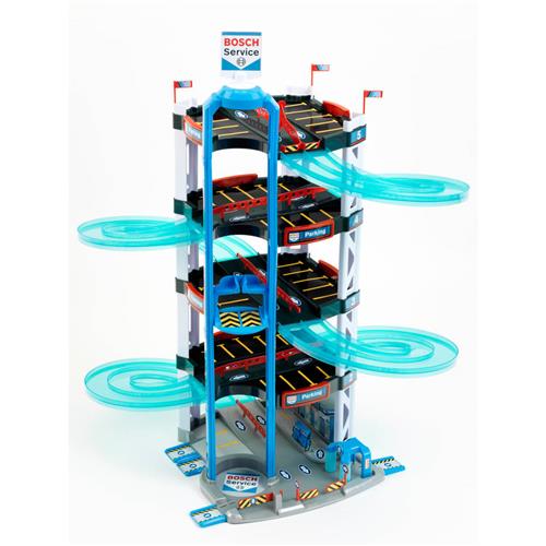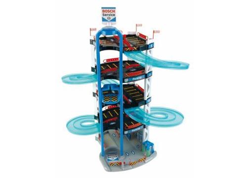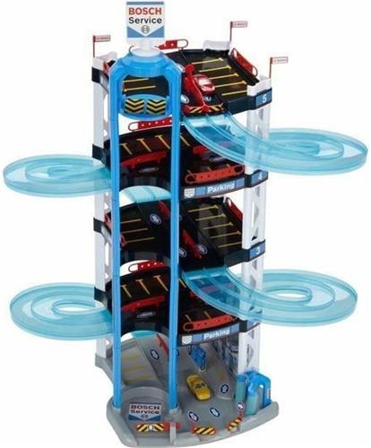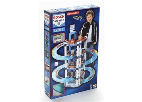 De Bosch Car Service autogarages behoren tot de luxe-edities onder de speelgoedgarages. Ze hebben allemaal twee auto's die op de dubbele rijstroken geweldig tegen elkaar kunnen racen. Alle garages zijn gemaakt van kwalitatief hoogwaardig kunststof en heel stevig. Er zijn tal van liefdevolle details - alles om zorgeloos en vol fantasie te kunnen spelen. Bij de Bosch Car Service serie hoort zelfs een metalen verzamelkoffer waarin de auto's na de races veilig kunnen worden opgeborgen of naar nieuwe speeltuinen en racebanen kunnen worden meegenomen. Parkeergarage met dubbele oprit en twee kleine raceauto's. Als accessoires zitten er ook een lift, een benzinepomp en wasstraat bij.