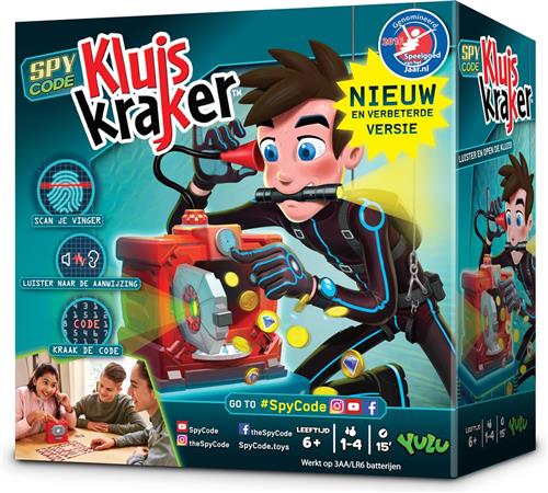 Kun jij de code ontdekken? Kraak de code met je spionnen gereedschap en open de kluis met de vingerafdrukscanner. En verzamel vervolgens alle gouden munten en diamanten. Zet al je spionnenvaardigheden in om de geheime code van de kluis te kraken. Zet om te beginnen de kluis op tafel, samen met alle 18 speelkaarten die je met de cijfers naar boven neerlegt. De jongste speler mag beginnen. De speler kiest een kaart en legt deze voor zich neer. Daarna draait de speler de draaischijf naar het corresponderende cijfer. Leg je vinger op de vingerafdrukscanner en luister of je het juiste cijfer hebt gekozen en de code hebt gekraakt. Gaat de kluis niet open, dan betekent dit dat je een verkeerd cijfer hebt ingevoerd en geeft de kluis je een geheime aanwijzing die alleen hoorbaar is voor de speler die aan de beurt is. Zo ja, dan gaat de kluis open, brandt er een groen lampje, kun je je munten pakken en daarna de kluis sluiten voor de volgende ronde. Wanneer je de alarmbelmunt vindt, betekent dit dat de politie is gewaarschuwd en je snel al je munten terug moet stoppen via de bovenkant van de kluis. Degene die als eerste vijf gouden munten of twee diamantmunten heeft verzameld, wint het spel! Genomineerd voor Speelgoed van het Jaar 2016.