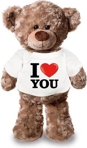 Laat je geliefde smelten met deze schattige knuffelbeer van 24 cm hoog met een t-shirt met de lieve boodschap "I love you". Deze knuffelbeer is gemaakt van zacht polyester en is wasbaar tot 30 graden, ideaal voor langdurig knuffelplezier. Let op: de knuffel is niet geschikt voor de droger.