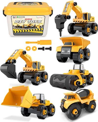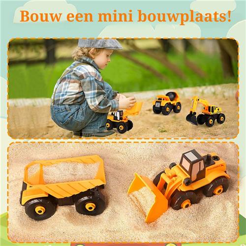 - Educatief en Creatief: Dit speelgoed stimuleert de creativiteit en verbeeldingskracht van kinderen. Ze kunnen verschillende combinaties maken met de afneembare onderdelen en zo hun eigen bouwvoertuigen ontwerpen. Het bevordert ook de hand-oogcoördinatie en fijne motoriek tijdens het monteren en demonteren van de voertuigen.