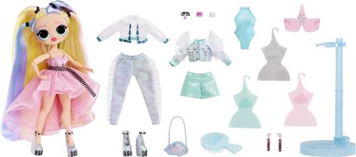 Pak meerdere verrassingen uit, waaronder een OMG Sunshine Makeover-modepop, felle mode, schoenen, accessoires, een wolkenportemonnee, een zonnebril, een halsketting met een harthanger, armbanden, oorbellen, kleerhangers, een haarborstel en een poppenstandaard.