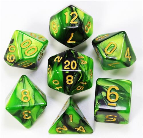 Deze dobbelstenen zijn gemarmerd in groen en zwart, perfect voor karakters die verbonden zijn met de natuur. Ze zijn voorzien van gouden cijfers en vormen een complete polyset van 7 verschillende dobbelstenen, waaronder D4, D6, D8, D10, Dxx%, D12 en een D20. Deze set is geschikt voor alle spellen en wordt geleverd met een dicebag.