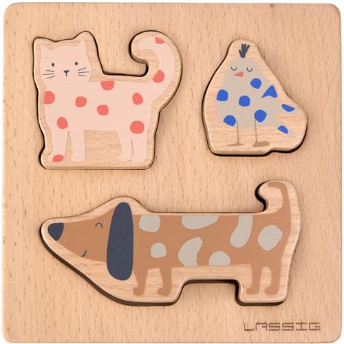 Ontdek de LÄSSIG houten insteekpuzzel, perfect voor peuters vanaf 12 maanden. Gemaakt van 100% FSC-gecertificeerd beukenhout, biedt deze puzzel niet alleen speelplezier, maar ook een duurzame keuze voor uw kleintje. Met vrolijke diermotieven zoals honden, katten en vogels stimuleert deze puzzel de fijne motoriek en concentratie op een speelse manier.