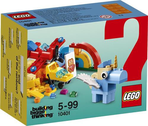 Wat vind je aan het einde van de regenboog? Geniet van het creëren met LEGO stenen. Bouw een felgekleurd vliegtuig en stijg op of verzin zelf een fantastisch wezen. Laat je fantasie de vrije loop! Kleine stenen leiden tot grootse ideeën! Moedig je kind aan om creatief aan de slag te gaan met deze special edition LEGO set!. Laat je kind ontdekken wat je aan het einde van de regenboog zou kunnen vinden met dit assortiment kleurrijke LEGO stenen en speciale elementen! Moedig je kind aan om grootser te denken en creatief te zijn!Help je kind grootser te denken, groter te bouwen en creatief aan de slag te gaan met deze op een regenboog geïnspireerde special edition LEGO set. De set bevat allerlei kleurrijke stenen en elementen, plus een unieke LEGO tegel ter ere van het 60-jarig bestaan. De fantasie van een kind kan altijd uitgebreid worden met LEGO stenen, hoe groot die ook is. Dit bouwspeelgoed biedt verschillende moeilijkheidsniveaus en is zeer geschikt als starterset voor beginnende LEGO bouwers. Wat zal jouw grote denker bouwen? Specificaties: