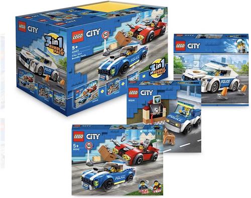 Daarnaast bevat deze bundel de LEGO City politiehondenpatrouille 60241, waarbij een boef probeert in te breken bij de juwelier. Spring in de politieauto, laat de politiehond los en arresteer de boef voordat hij kan ontsnappen. Ook is de LEGO City politiepatrouille auto 60239 onderdeel van deze set, waarmee je ervoor zorgt dat het verkeer soepel blijft rijden in LEGO City.